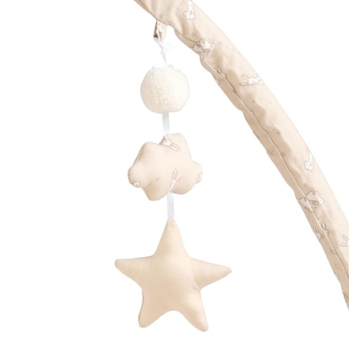 Schauen Sie Ihrem Baby stundenlang beim Entdecken und Spielen auf der runden Krabbeldecke BULLE D.90 in den Farben Ecru, Weiß und Taupe zu. Bequem auf dieser weichen, kuscheligen Spieldecke liegend kann Ihr kleiner Liebling die an 2 abnehmbaren Bögen hängenden und an der Decke befestigen Spielsachen erforschen. Hasen, Sterne und Pompons in zarten Farben... Ihr Baby macht sich mit einem herrlichen, stimmungsvollen Universum vertraut. Der Vorzug dieser Krabbeldecke? Alle Baumwollelemente stammen aus biologischem Anbau. Wir wollen nur das Beste für Ihren Schatz!