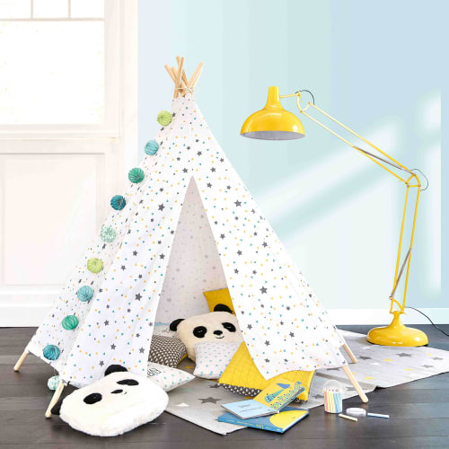 Dieses Kindertipi wird schnell zum Lieblingsversteck Ihrer kleinen Indianers zum Spielen, Lesen und Träumen! Dieses recht große Stofftipi ist mit einem schönen Muster verziert und kann im Schlafzimmer, Spielzimmer oder Esszimmer aufgestellt werden. Zum Aufbauen werden 6 Holzstöcke einfach ins Zelt hineingeschoben und dann oben mit einer Schnur zusammengebunden. Die Deko-Besonderheit: das grafische bunte Muster mit einer Mischung aus Sternen und kleinen Dreiecken. Unser Tipp: Sorgen Sie im Voraus für den nötigen Platz für das Tipi im Kinderzimmer.