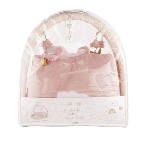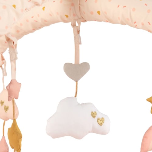 Para divertir a tu peque y desarrollar su motricidad, no hay nada mejor que la alfombra de estimulación del bebé redonda de algodón rosa y dorado D.90 LOU. En sus 2 arcos desmontables se encuentran unos pequeños arco iris, unas nubes, unos corazones y unas estrellas suspendidos que lograrán que tu angelote se divierta y descubra sus sentidos. En la cómoda y mullida alfombra también podrá atrapar y tocar los numerosos elementos de diferentes texturas. Una alfombra de estimulación estética que completará maravillosamente los otros accesorios de la gama LOU.
