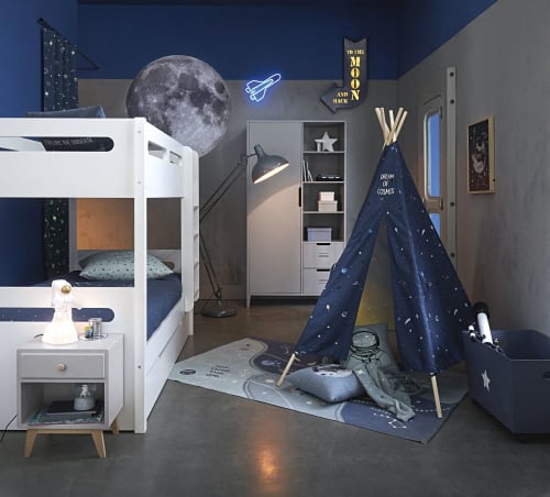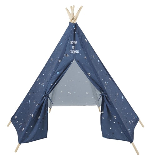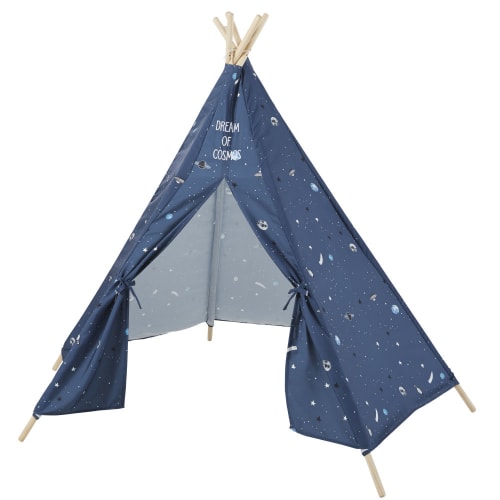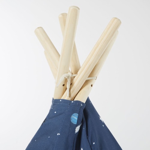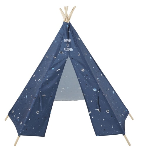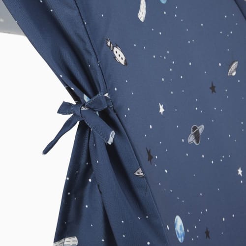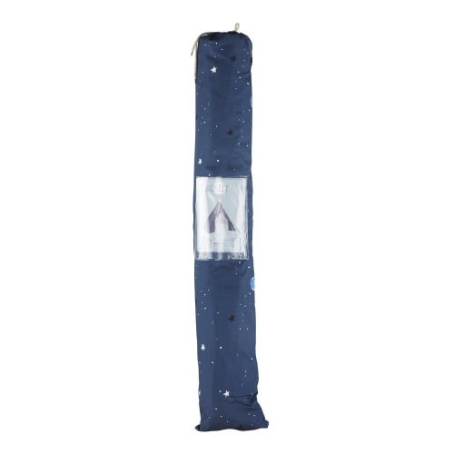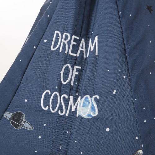 Les rêves d'aventures de votre petit cosmonaute seront infinis grâce au tipi enfant bleu marine imprimé GALAXY. Décoré de planètes, fusées, étoiles sur un fond bleu nuit, il créera une ambiance galactique dans la chambre de votre bout de chou, parfait pour se créer des histoires imaginaires. Pratique, le tipi est doté de nouettes pour l'ouvrir et est complété d'un pochon en tissu pour le transporter. Que les aventures intersidérales commencent !