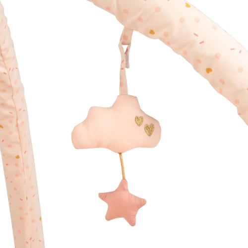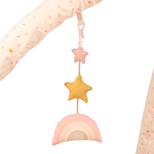 Om je kleine schat te ontspannen en zijn hand-oogcoördinatie te stimuleren, is er niets beter dan de LUI ronde babyspeelmat van roze en goudkleurig katoen. Aan de twee afneembare bogen vinden we kleine regenboogjes, wolkjes, hartjes en sterren die je kleine engeltje dolle pret bezorgen en hem zijn zintuigen laten ontdekken. De vele elementen met een verschillende textuur op dit comfortabele en zachte tapijt gaat hij met plezier vastnemen en aanraken. Een mooie speelmat die perfect past bij de andere accessoires van de LOU-collectie.